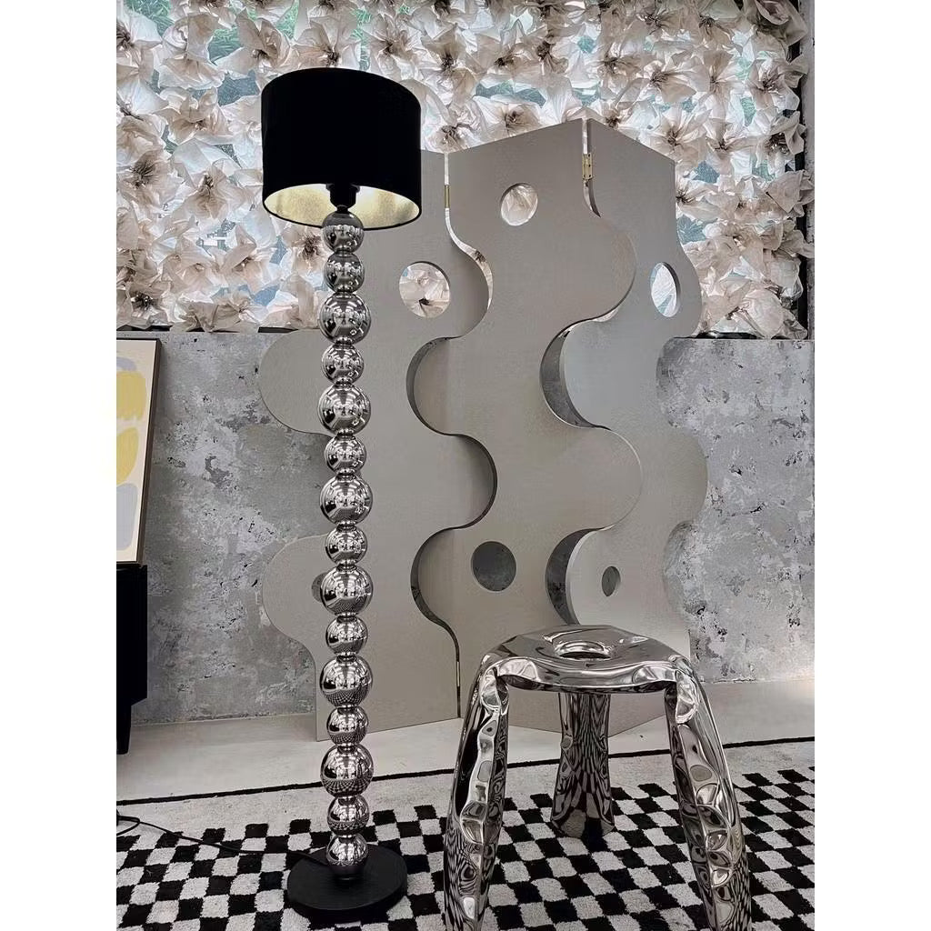 Transform your living space with this Vintage-Inspired Luxury Floor Lamp. More than just a lighting fixture, this lamp is a sculptural masterpiece that blends mid-century charm with ultra-modern aesthetics. Featuring a striking "stacked sphere" chrome body and a sophisticated black fabric shade, it is designed to be the focal point of any room.